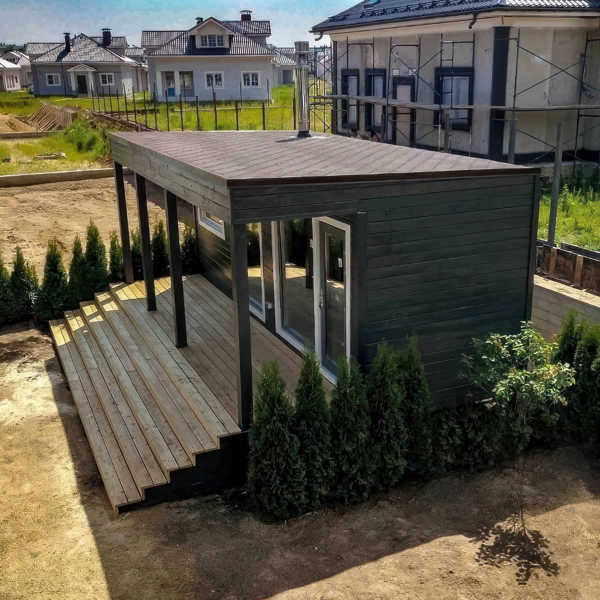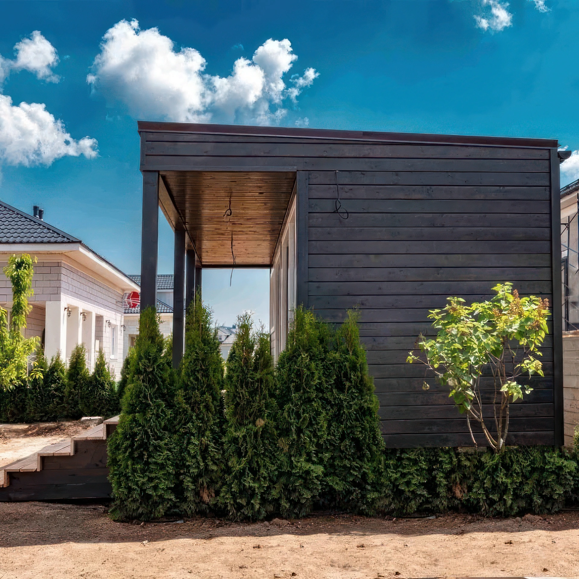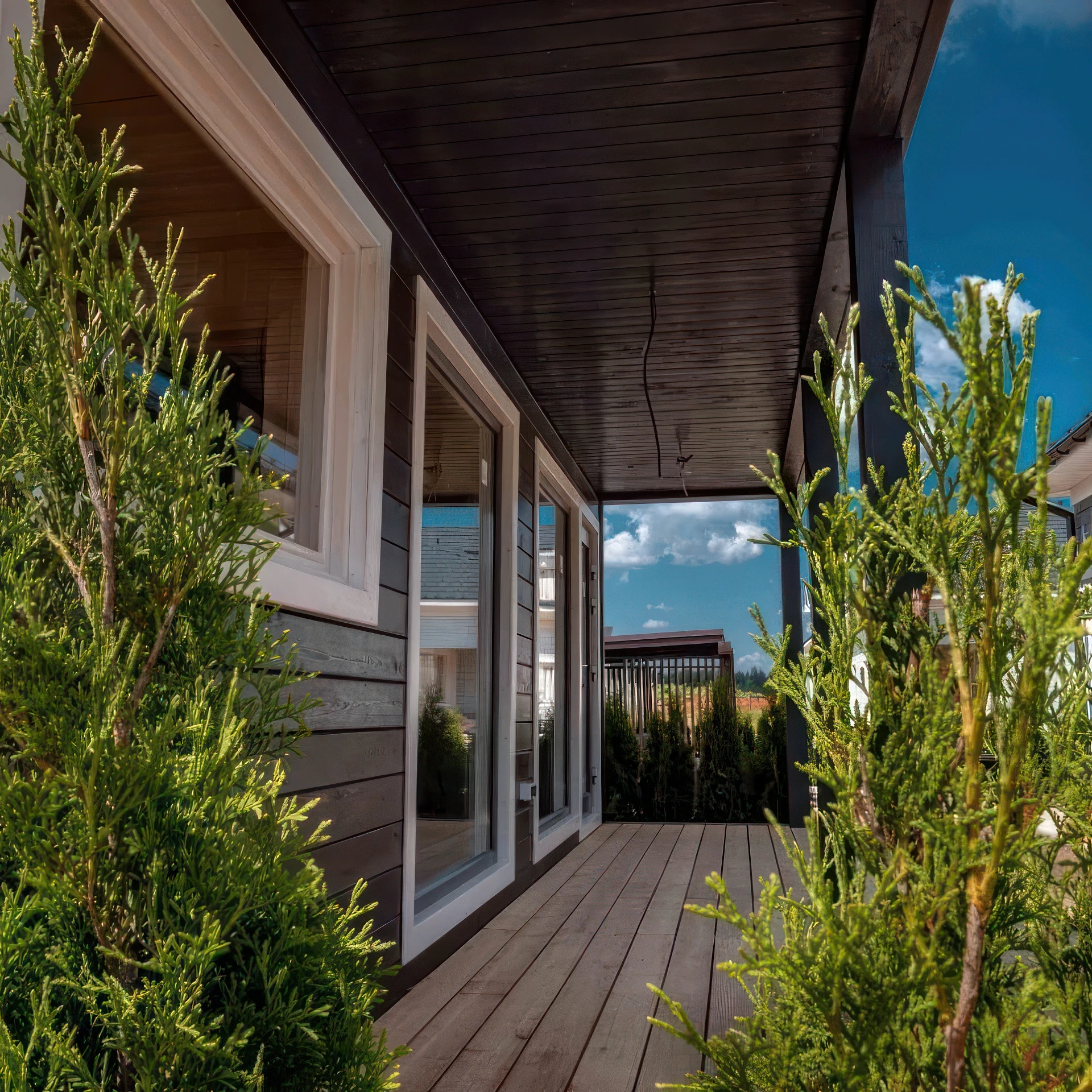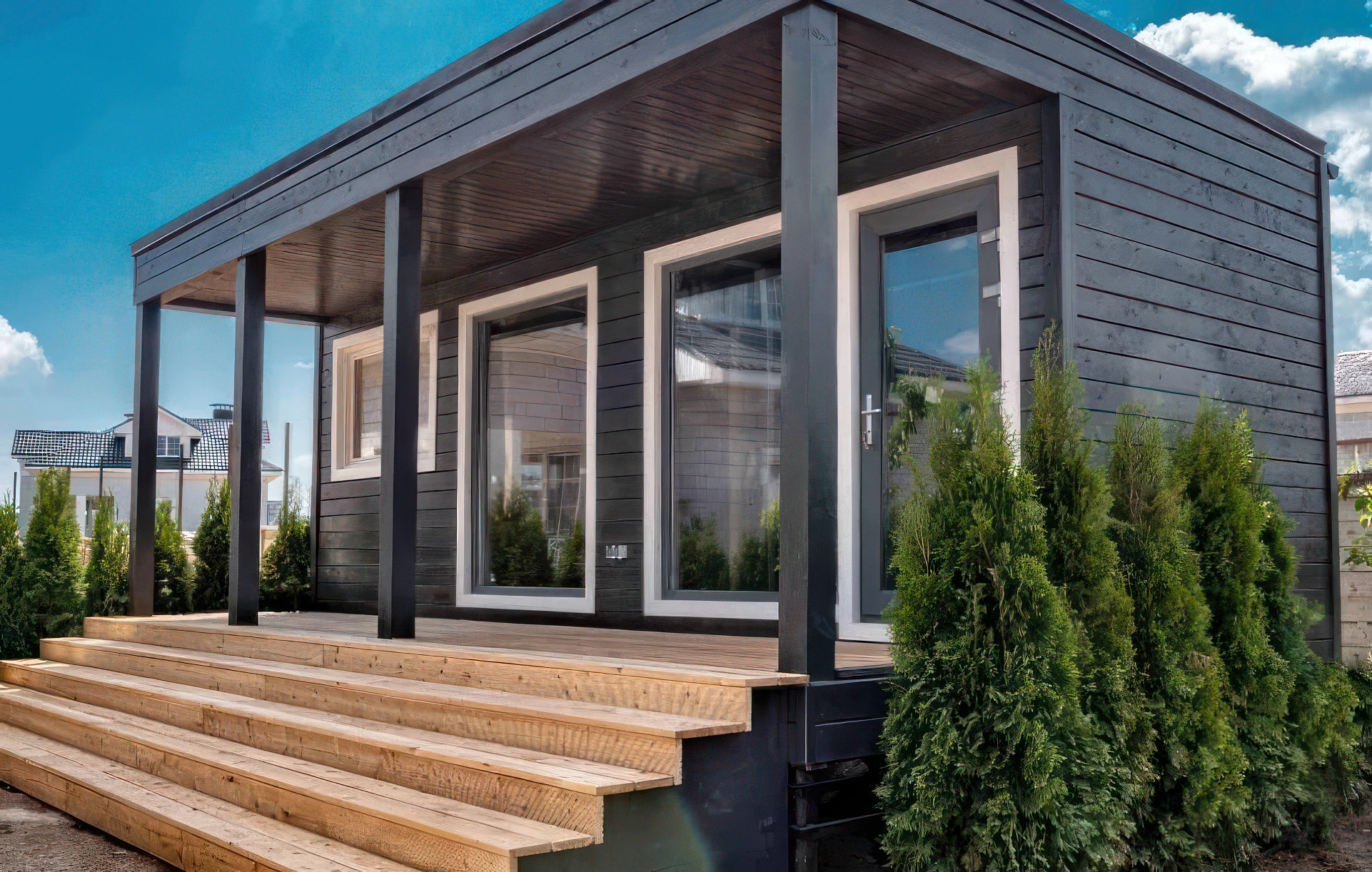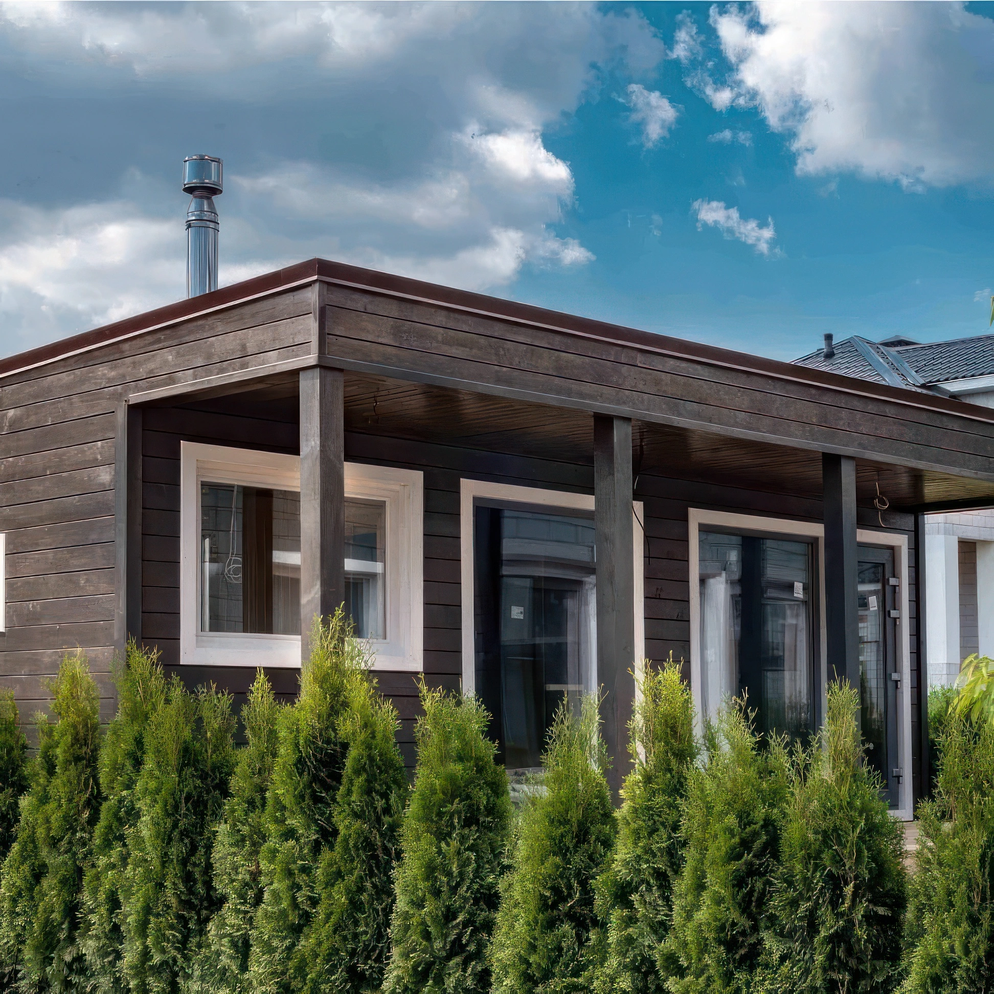 The ventilated façade allows multiple finishes, including plank, profiled sheet, or click-folded designs. Meanwhile, the roof is protected with a durable metal profile with polymer coating or click seam, ensuring longevity and resistance.